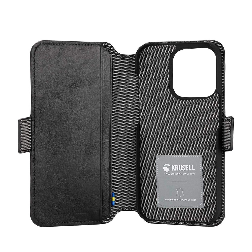 Krusell iPhone 14 Pro Case Leather PhoneWallet Black is a black phone case for iPhone 14 Pro.