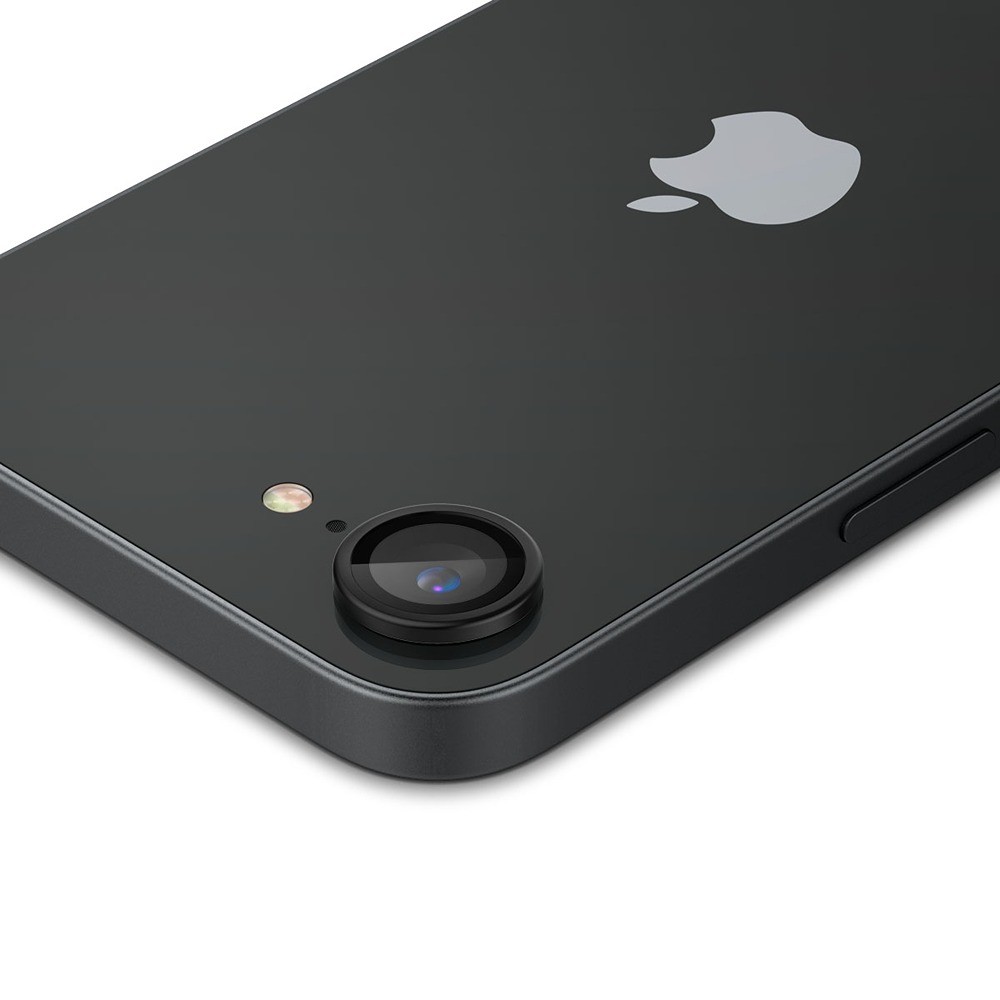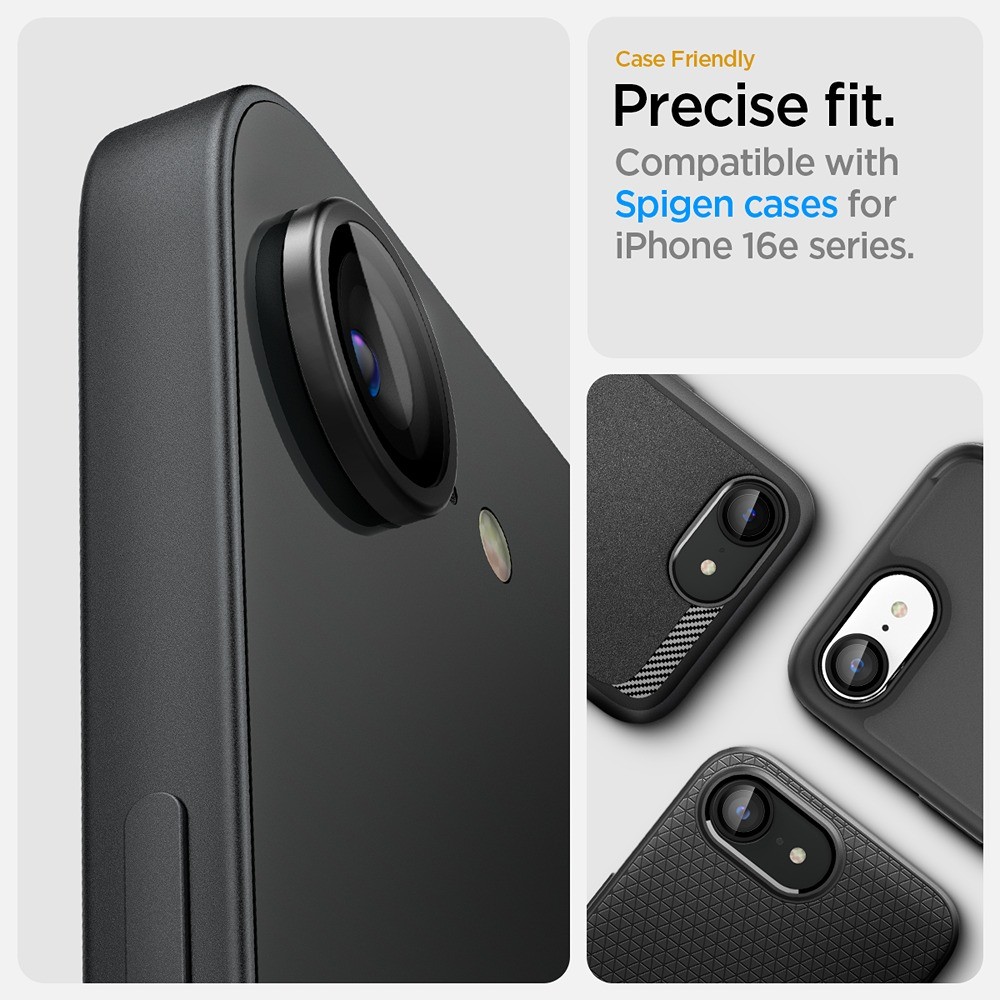 Spigen iPhone 16e/17e camera protector GLAS.tR EZ Fit Optic Pro 2-pack is a black and transparent camera protector for the iPhone 16e/17e.