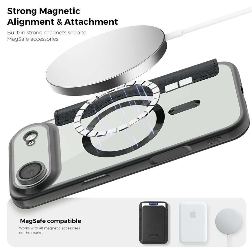The mobile protector is MagSafe-compatible with built-in magnets for charging and accessories that attach magnetically.