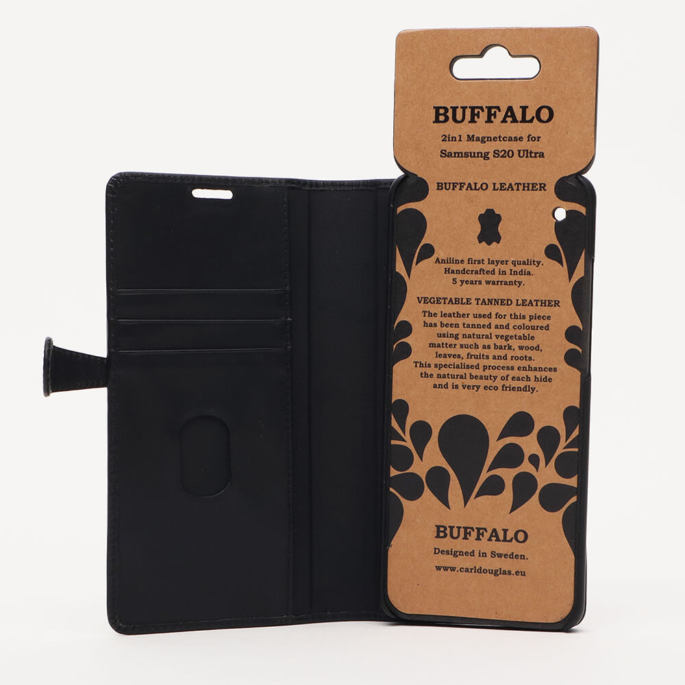 BUFFALO wallet case made of Aniline First Layer quality leather. The leather is handmade in India and the product is designed in Sweden. It has three card slots and one bill pocket. A magnetic clasp keeps the wallet closed. There is a speaker hole for conversation with the closed case. There is a finger hole for easier removal of a credit card. Your smartphone is protected in a magnetic shell that can also be removed from the wallet. The back of the case features the same exclusive buffalor leather.