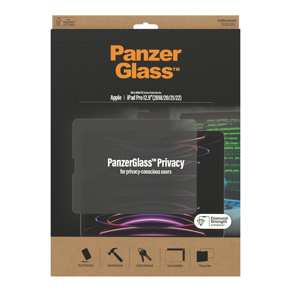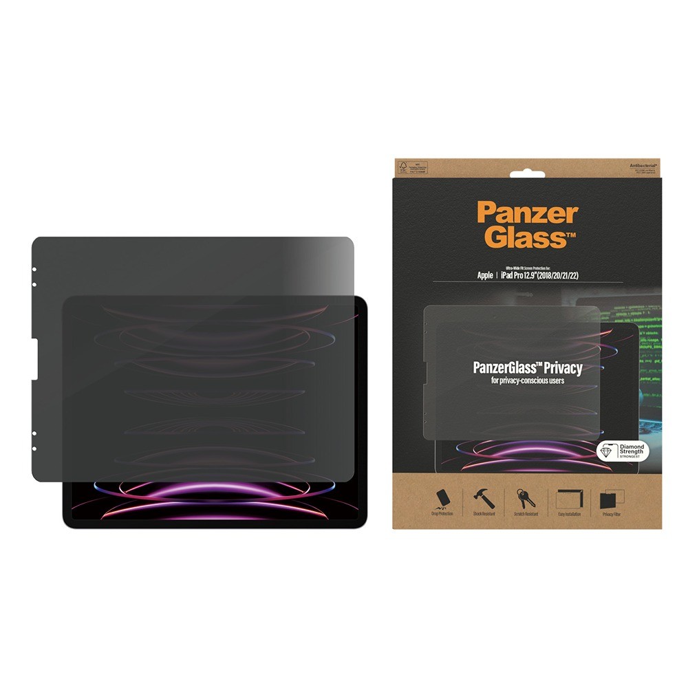 PanzerGlass iPad Pro 12.9 (gen 3/4/5/6) Screen Protector Edge-to-Edge Case Friendly Privacy is a black and transparent protective glass for the iPad Pro 12.9 (gen 3) and the iPad Pro 12.9 (gen 4/5/6).