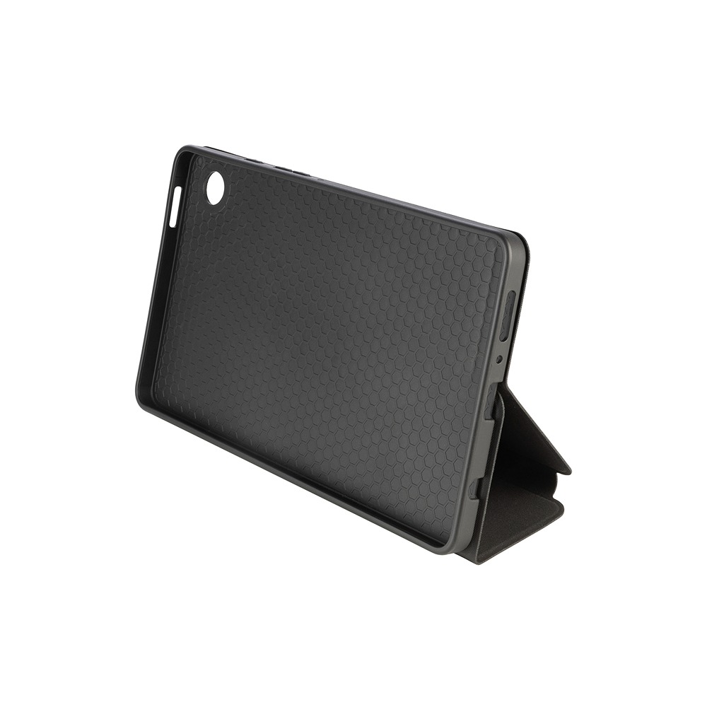 The exterior is made of PU with a textile texture. The interior is lined with microfiber, and on the inside there is a fixed TPU shell that holds the tablet in place.